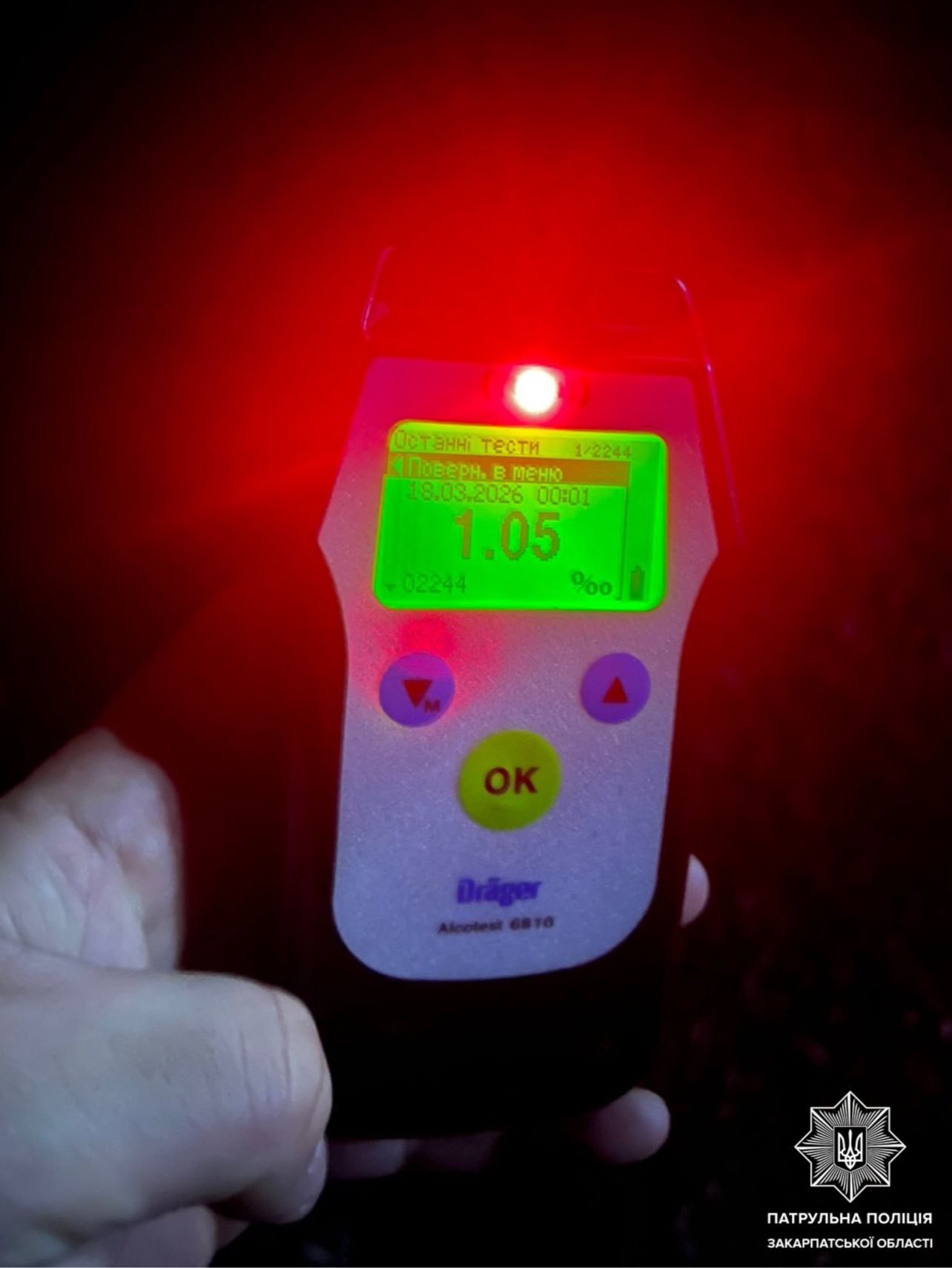 Під час розмови з жінкою-водієм поліцейські зафіксували у неї ознаки впливу алкоголю. Згодом їй було запропоновано пройти огляд прямо на місці зупинки, і результати підтвердили наявність алкоголю у крові – рівень склав 1,05 проміле, що значно перевищує допустиму норму.