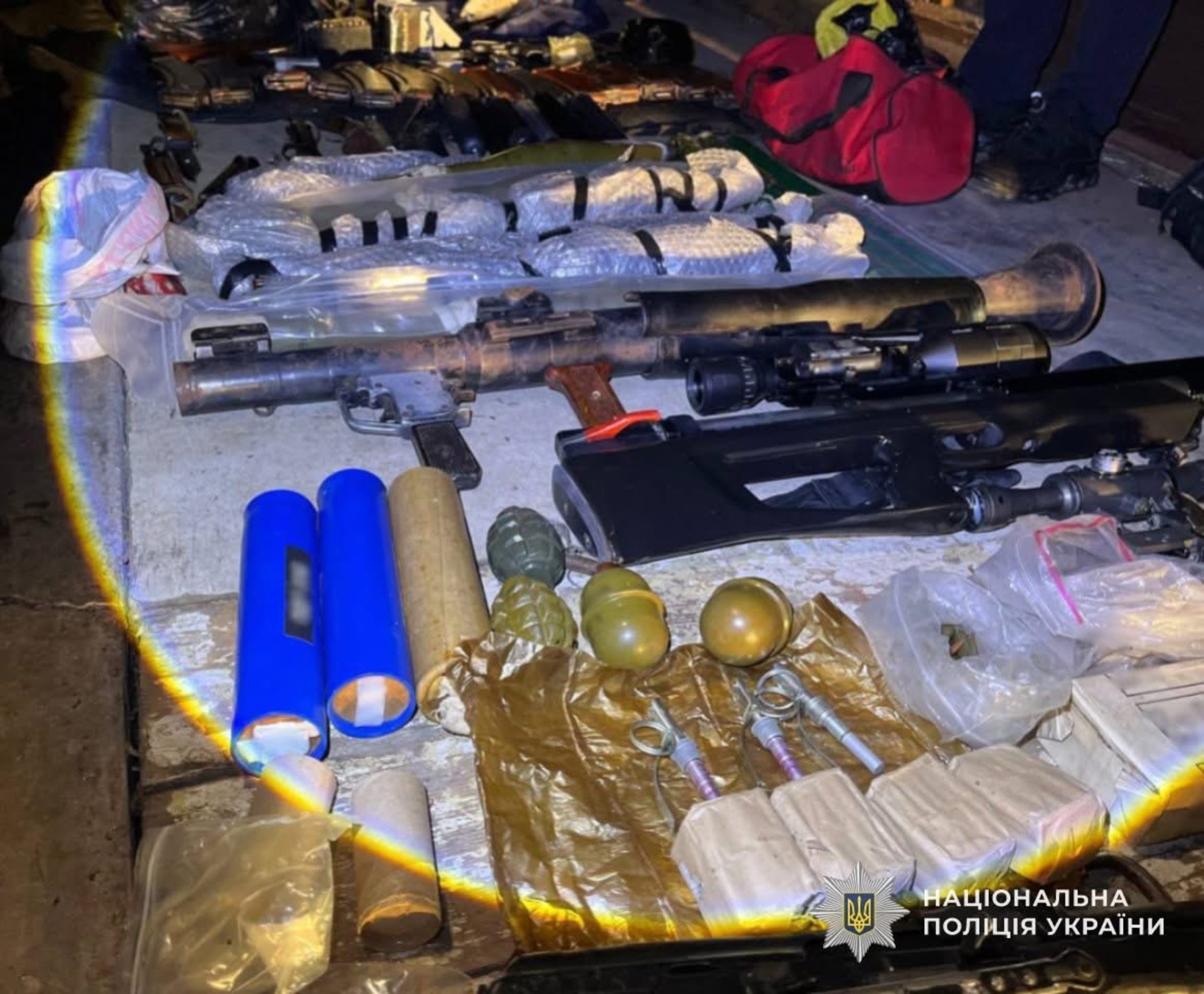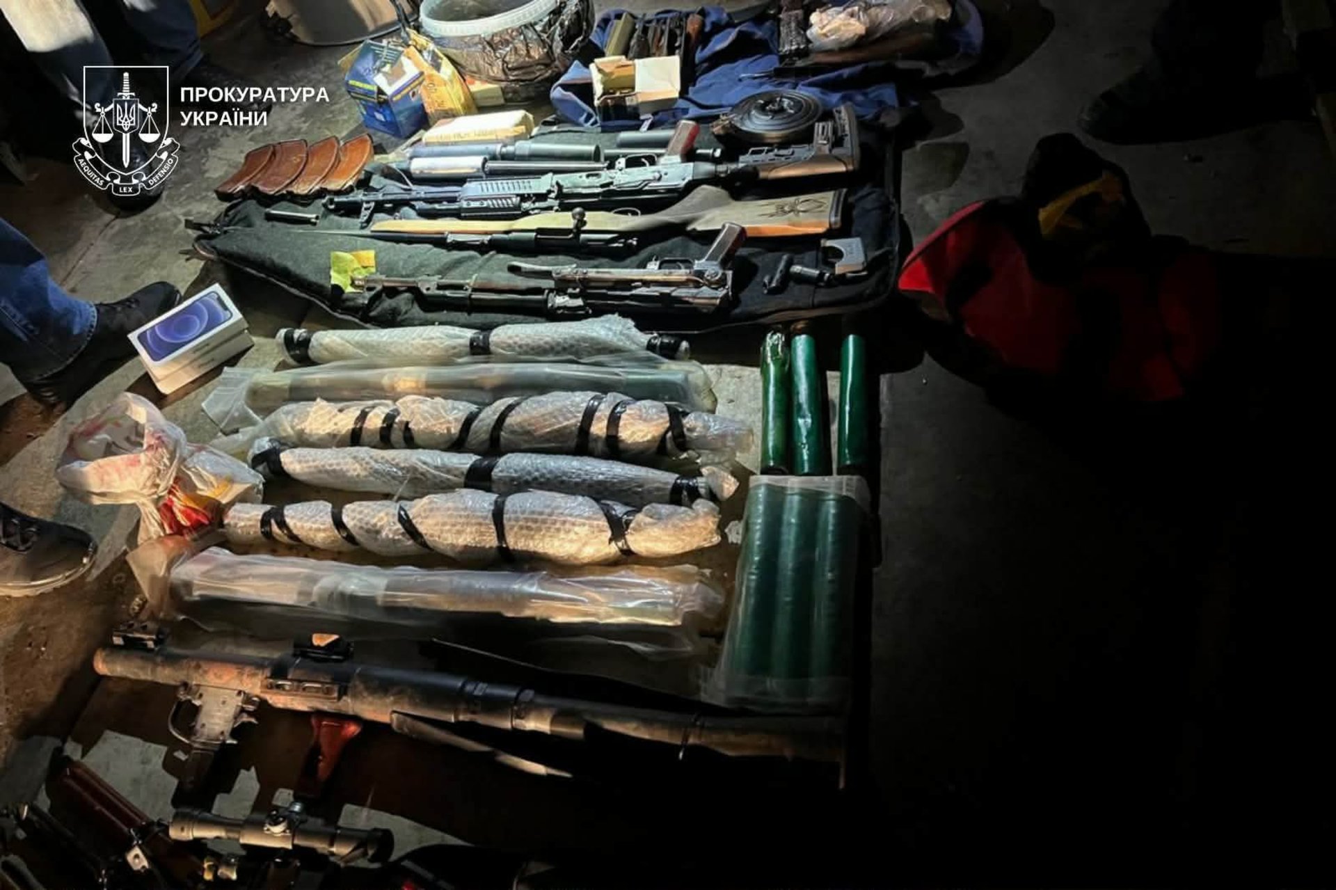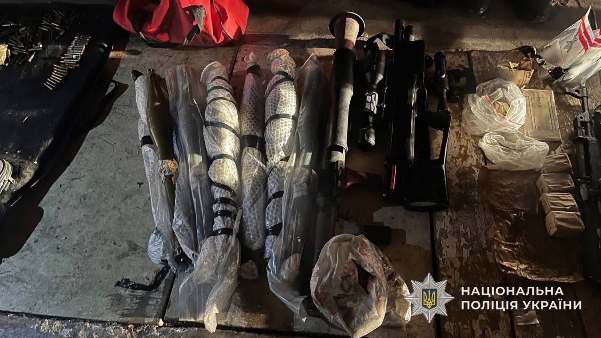 Під час обшуків поліцейські знайшли ручний протитанковий гранатомет, автомати АК-74 і АКМС, пістолет-кулемет Шпагіна, чотири бойові гранати, дві гвинтівки з оптичними прицілами, два пістолети з магазинами, 14 автоматних магазинів, понад 1300 набоїв різного калібру та інші предмети озброєння.