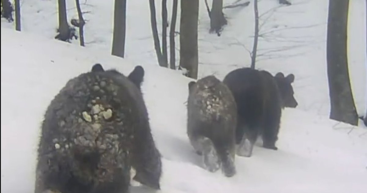 На цьому відеозаписі можна побачити чотирьох бурих ведмедів, які без обмежень рухаються по засніжених просторах Карпатських гір.