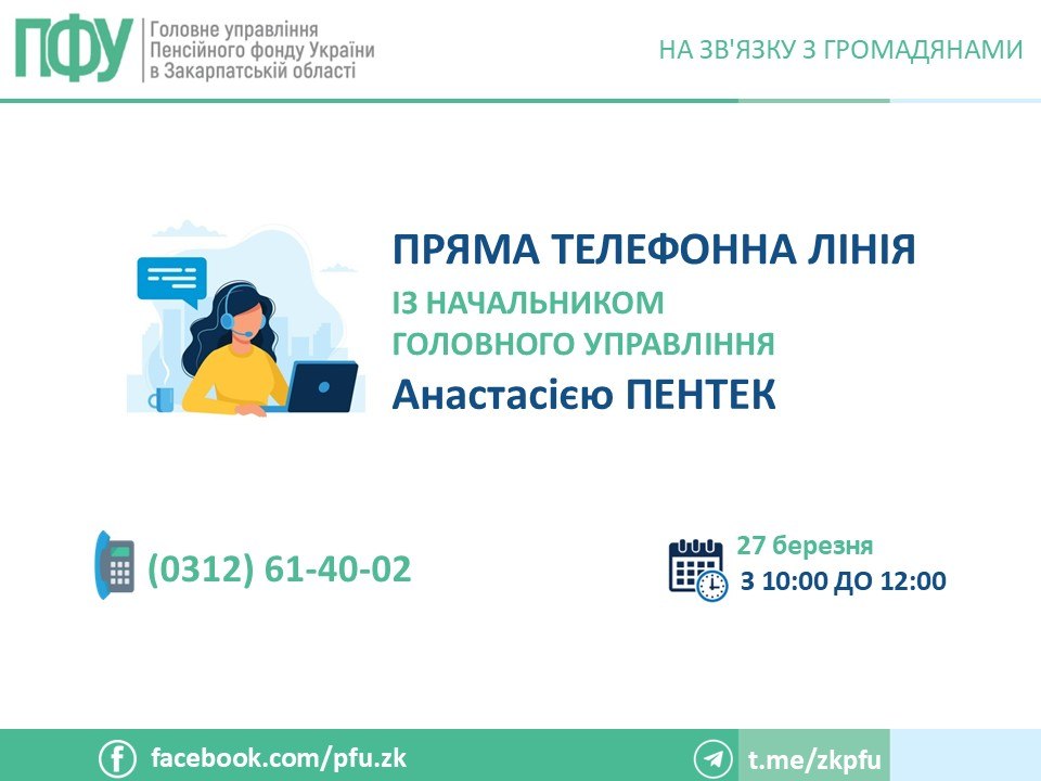 У п’ятницю, 27 березня, запланована пряма телефонна лінія з начальницею обласного управління Пенсійного фонду України Анастасією Пентек.
