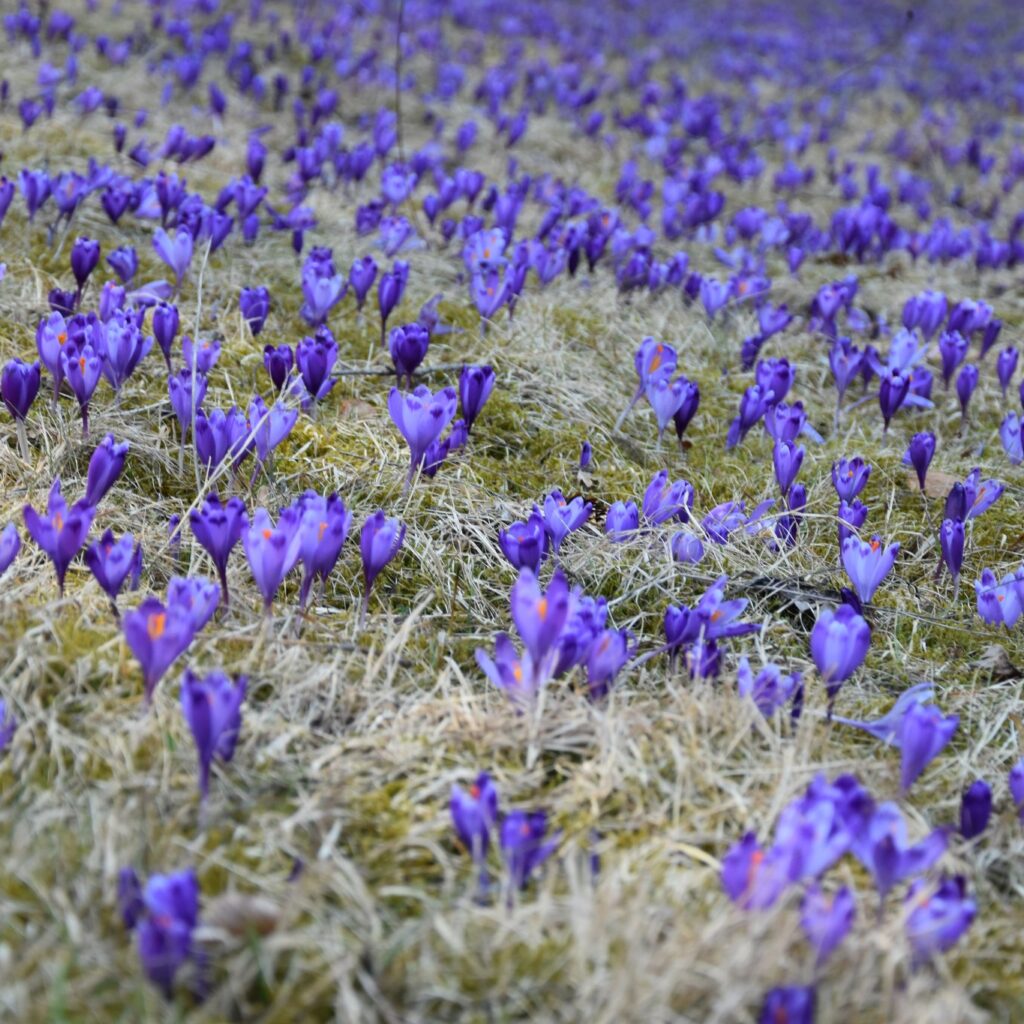 Після зимової сплячки парк оживають: ліси та галявини вкриваються першими весняними квітами — підсніжниками, крокусами та первоцвітами, створюючи яскравий природний килим й символізуючи відродження природи у всій своїй красі.