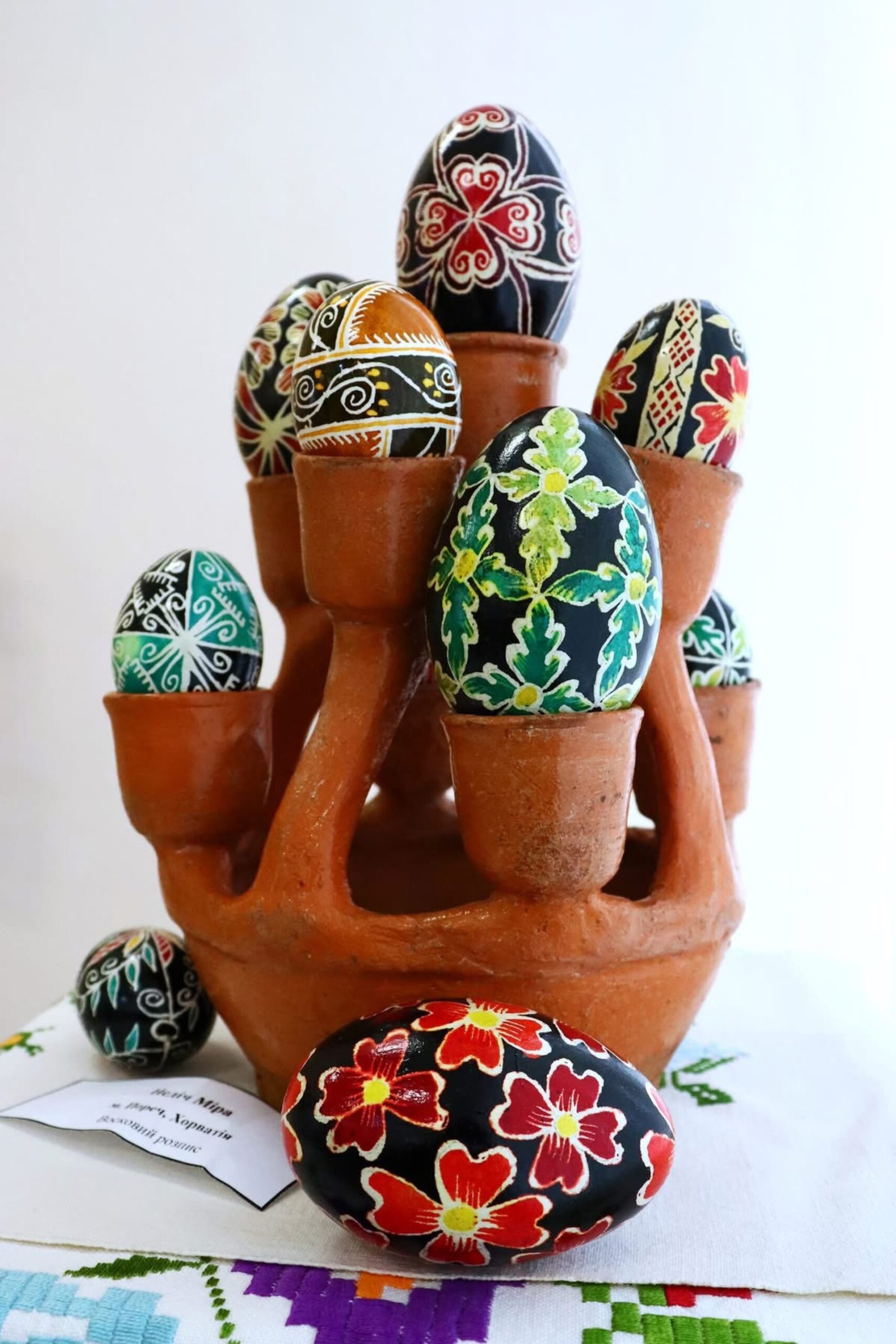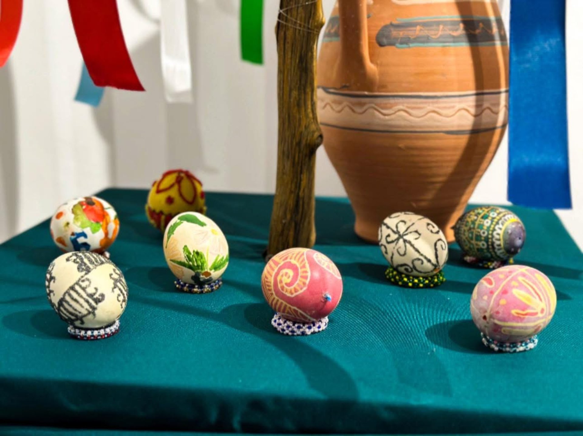 Експозиція складається з музейних зразків та авторських робіт сучасних майстрів, доповнених вишитими рушниками та живописними творами, створеними для Великодніх свят.
