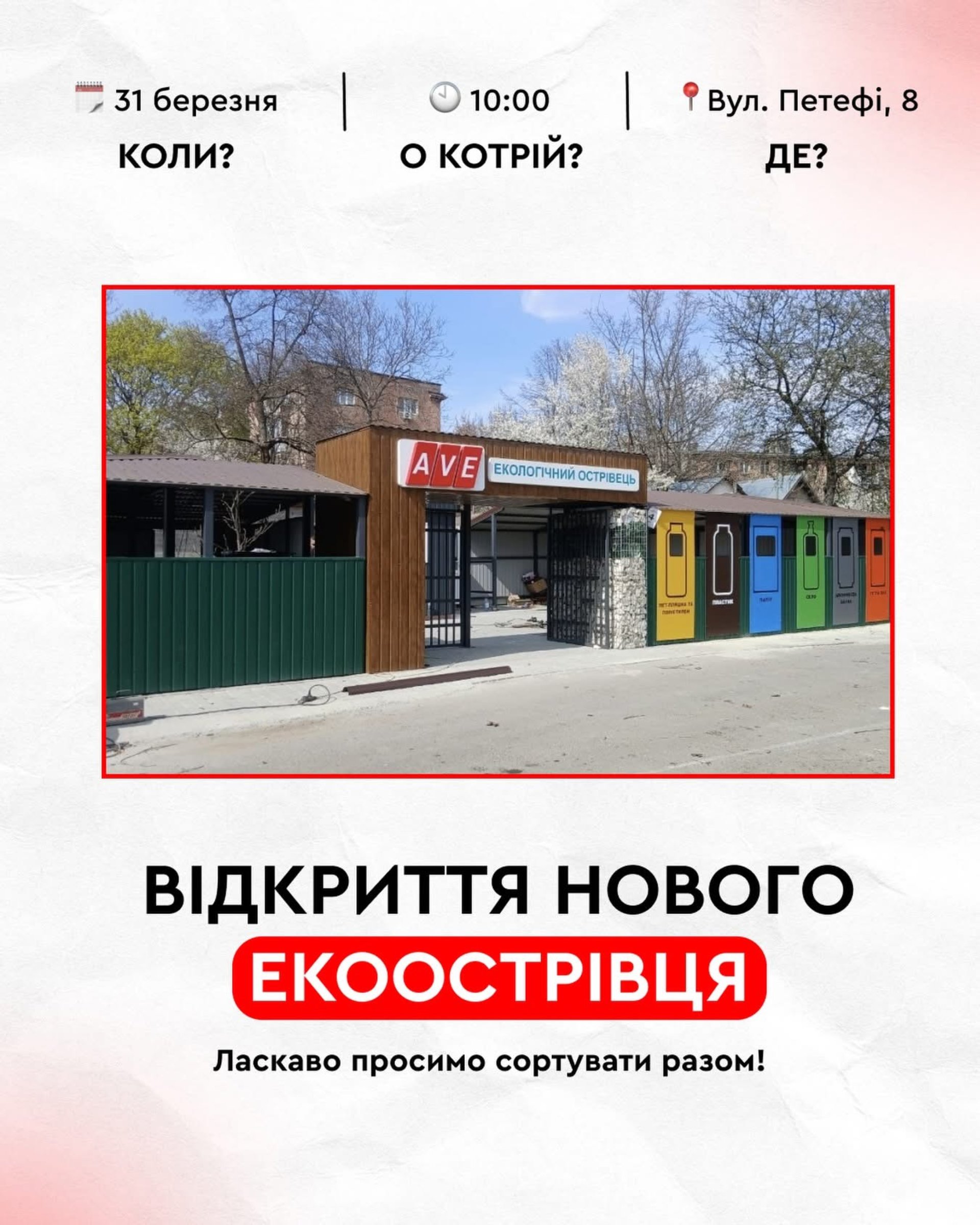 Час відкриття нового майданчика призначено на 10:00. Розташування цієї інфраструктури покликане забезпечити зручну умову для мешканців цього мікрорайону щодо здавання на переробку різних типів побутових відходів. Серед них папір, пластикові матеріали, металеві відходи, скло та батарейки.