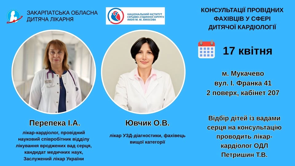 У Закарпатській обласній дитячій лікарні найближчим часом відбудуться консультації провідних дитячих кардіологів з Інституту серцево-судинної хірургії імені М.М. Амосова. Ця подія запланована на 17 квітня.