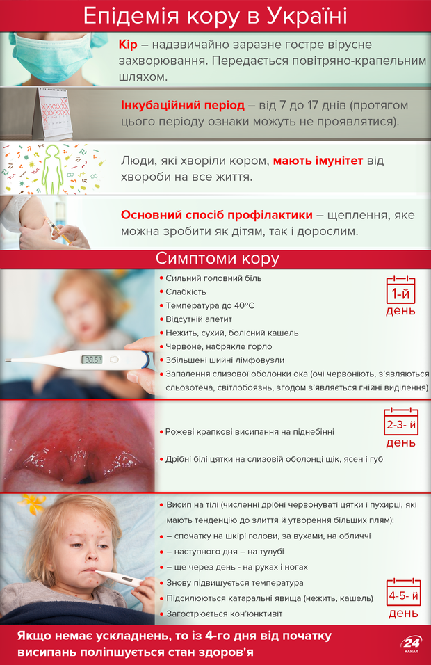 Це надзвичайно заразне інфекційне захворювання, що передається від хворої людини до здорової повітряно-крапельним шляхом, тобто при чханні, кашлі або розмові хворого. Вірус кору може жити в повітрі та на поверхнях — до двох годин після того, як хвора людина залишила приміщення.