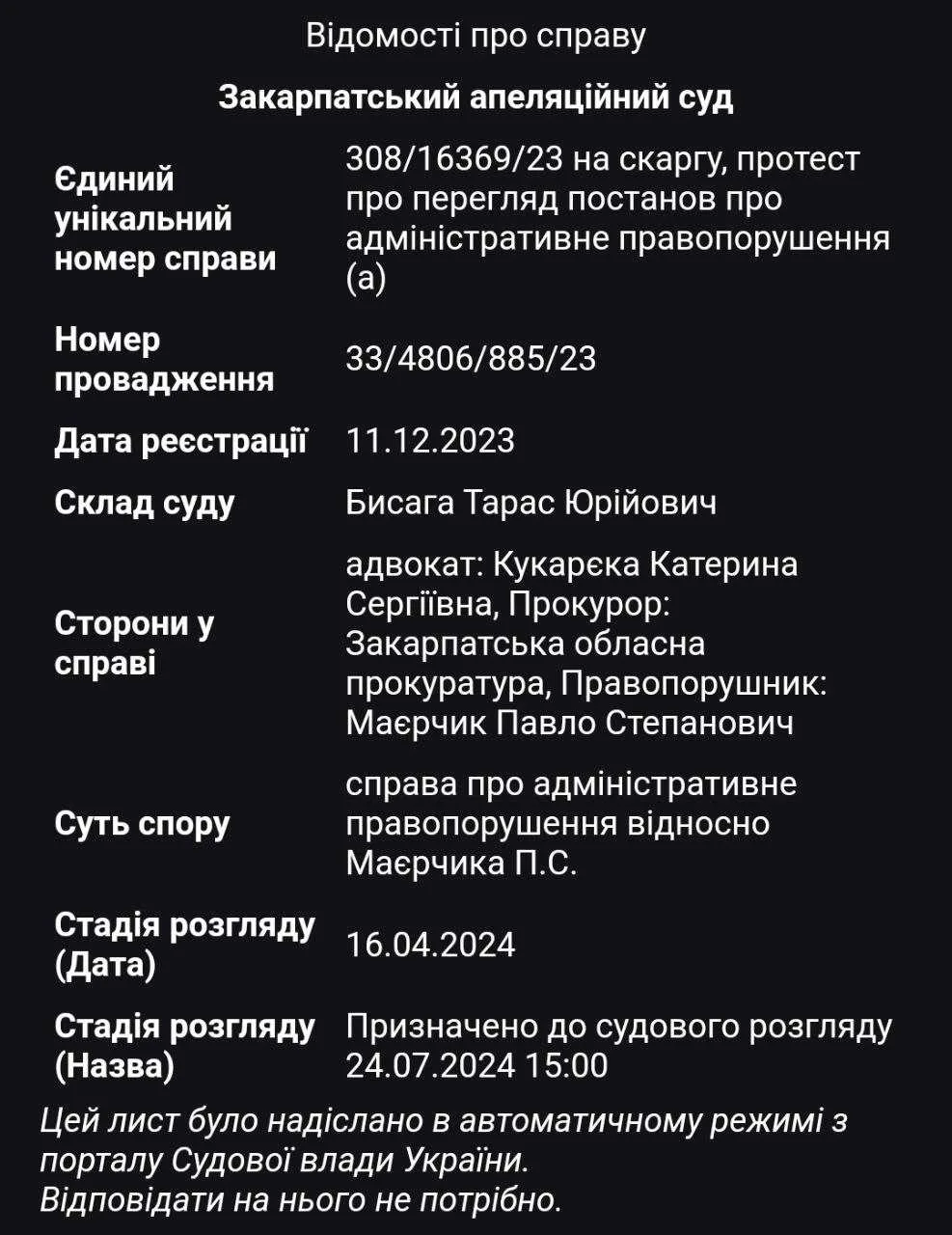 Завтра, у середу, 24 липня, о 15:00, суддя Закарпатського апеляційного суду Тарас Бисага розгляне справу №308/16369/23 щодо корупційного порушення депутата Ужгородської міськради від партії Медведчука “Опозиційна платформа – За життя”, члена земельної комісії Павла Маєрчика.