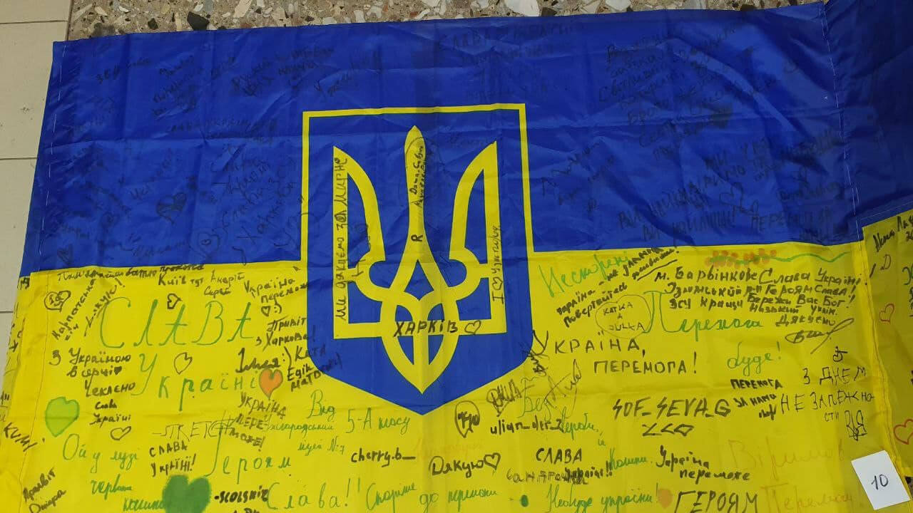 25-метровий прапор упродовж святкового дня кілька разів дошивали, тому що місця для підписів людям, які хотіли залишити свої побажання нашим захисникам, щоразу не вистачало.