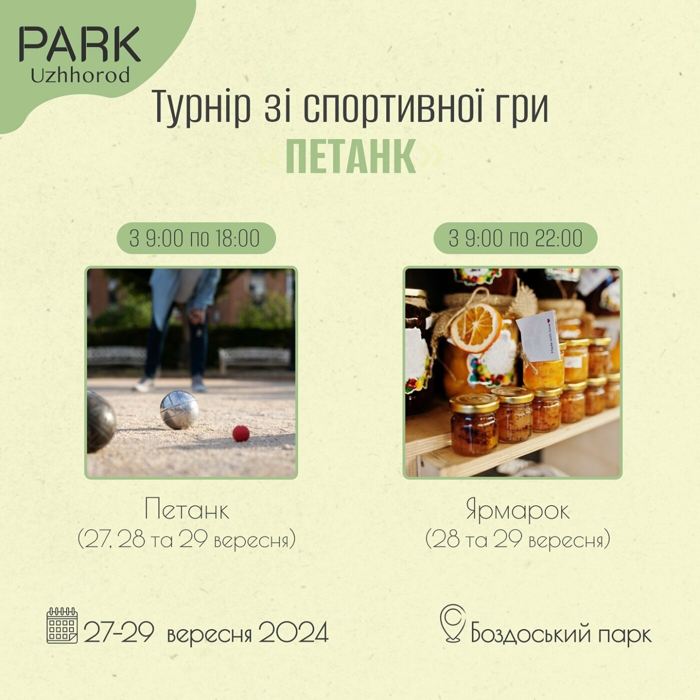 Як у вівторок, 17 вересня, повідомила Ужгородська міська рада, з п’ятниці, 27 вересня, по неділю, 29 вересня, в ужгородському Боздоському парку проходитимуть три етапи турніру з петанку з 9:00 по 18:00.