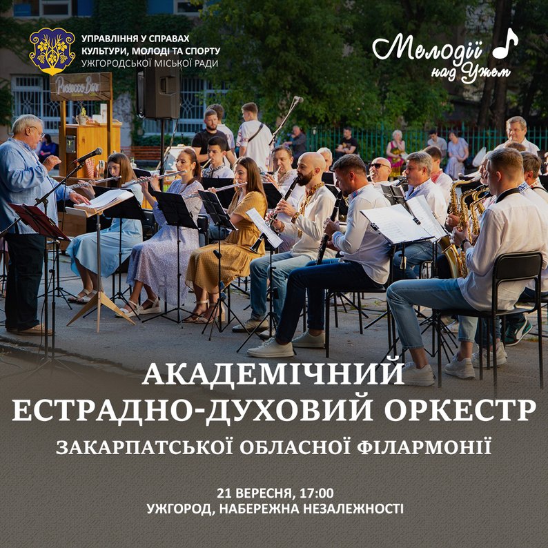 Ужгородців та гостей міста запрошуємо завтра, 21 вересня, о 17:00 на набережну Незалежності – на концерт естрадно-духового оркестру Закарпатської обласної філармонії під керівництвом народного артиста України Володимира Співака.