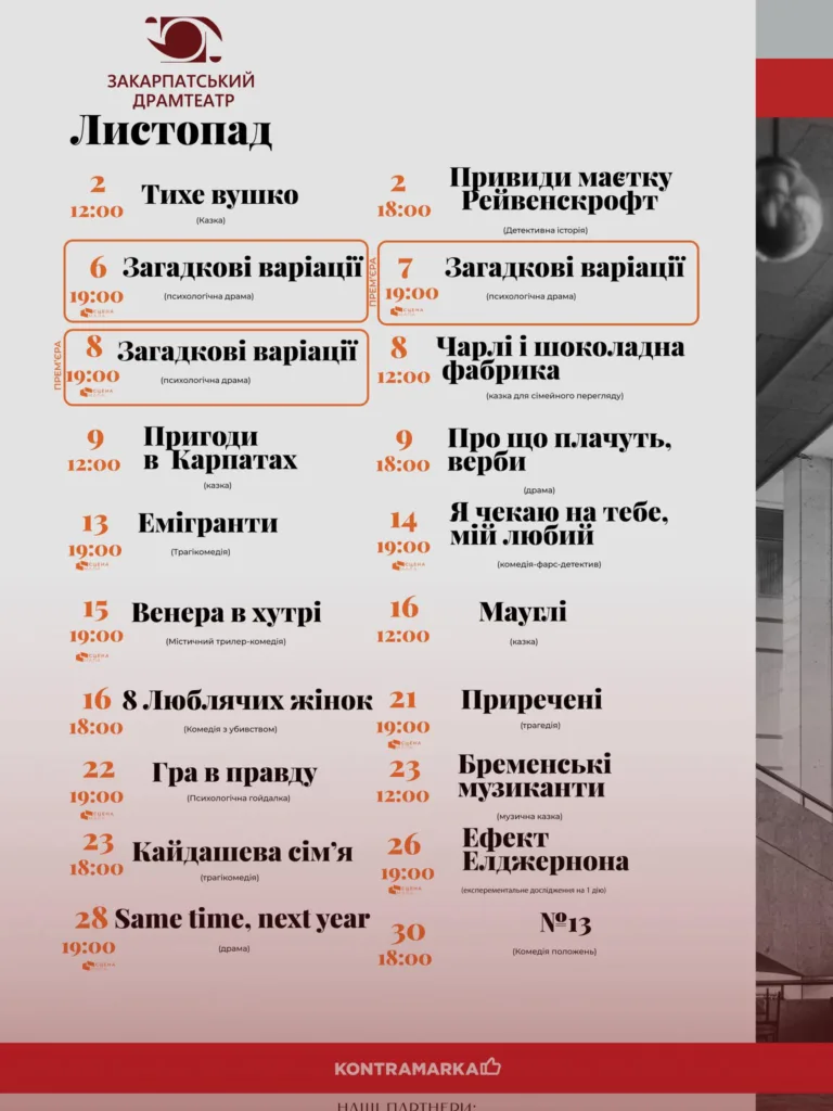 Закарпатський академічний музично-драматичний театр повідомив про оновлення у розкладі показів. 26 листопада о 19:00 відбудеться вистава «Ефект Елджернона». 30 листопада…