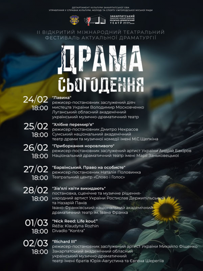 В Ужгороді з 24 лютого по 2 березня проходитиме Міжнародний театральний фестиваль «Драма сьогодення». Організатор фестивалю – Закарпатський академічний музично-драматичний…