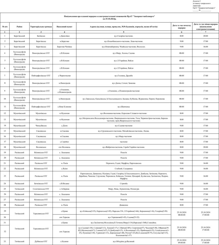У Закарпатській області 25 жовтня через проведення планових ремонтних робіт відключатимуть електропостачання жителям деяких районів та міст. Графік погодинного відключення…