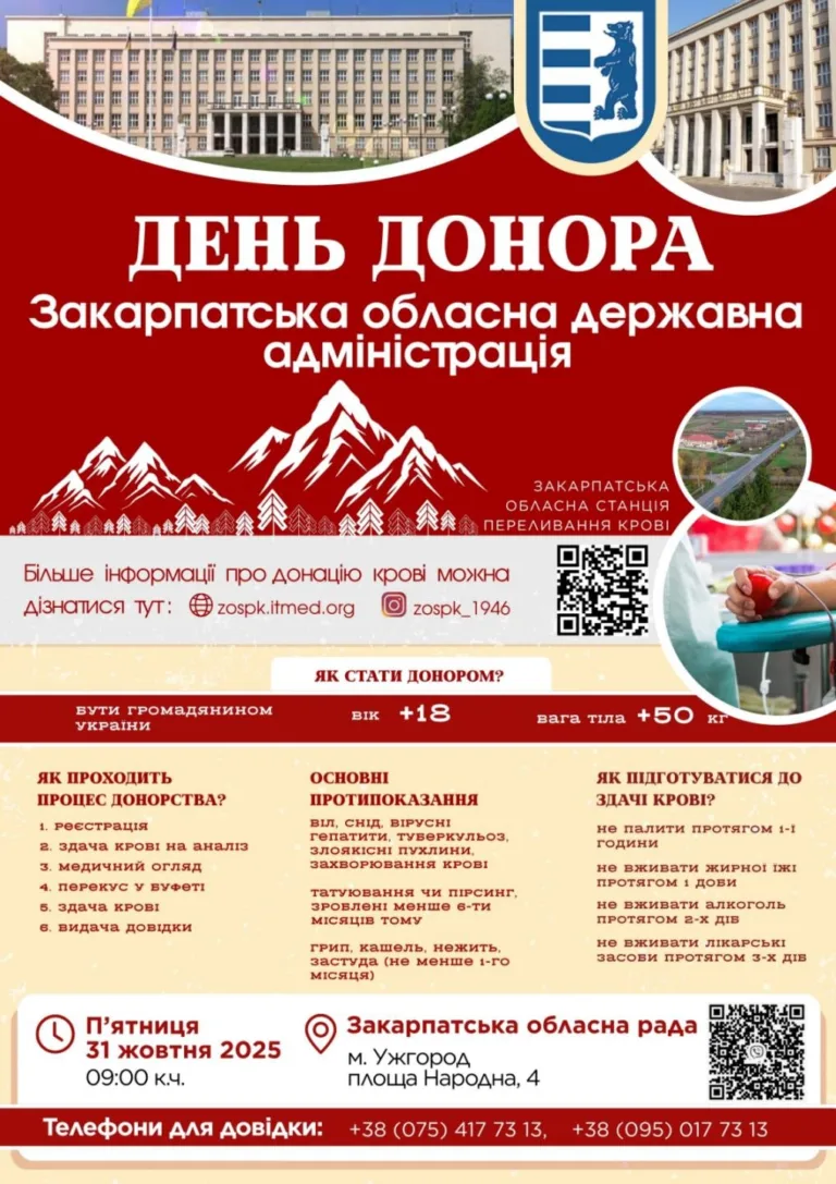 Завтра, 31 жовтня, Закарпатська станція переливання крові проведе виїзний забір крові у місті Ужгород у будівлі Закарпатської обласної адміністрації. Стати…