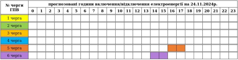 До уваги споживачів графік погодинних включень/відключень електроенергії на 24.11.2024. Графіки погодинних відключень електроенергії у неділю, 24 листопада, діятимуть з 14:00…