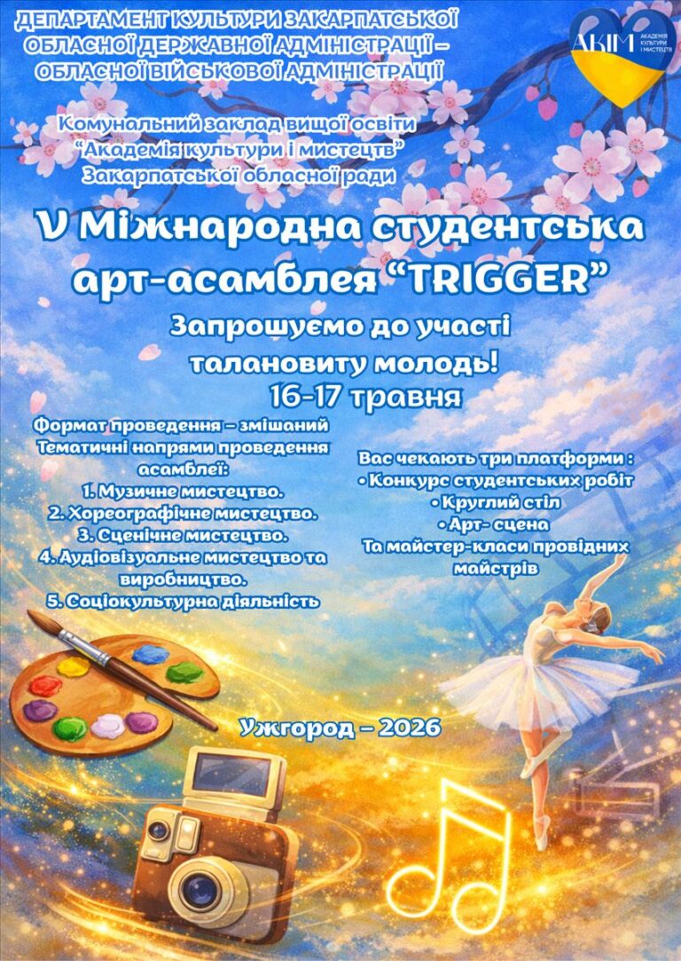 Академія культури і мистецтв Ужгорода запрошує талановиту молодь зі світу до участі у V Міжнародній студентській арт-асамблеї «TRIGGER», яка відбудеться…